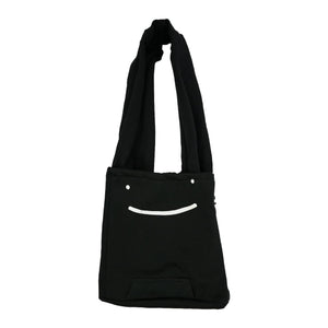 Handcrafted fleece tote bag, hoodie sleeve handles and a hoodie string that cinches with a stopper. Printed smiles on both sides!